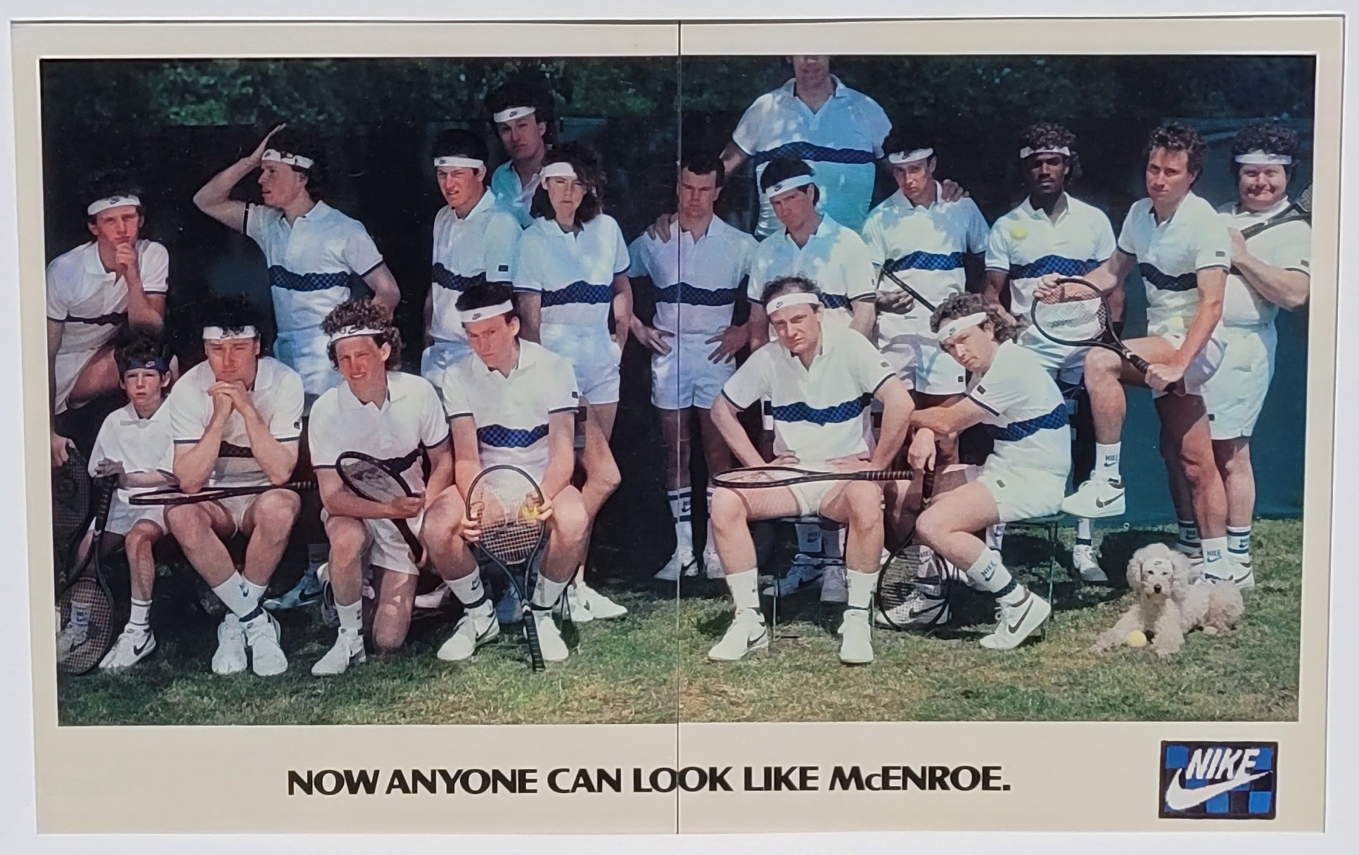 Now anyone can look like McEnroe! Within twenty-four hours, an ad in the local paper generated 150 replies from would-be John McEnroe. There was a tall one, a child one, a female one, a dog one! By adding his trademarks a headband and sultry expression a team of lookalikes gave the advertising copywriter his cue for the caption: You don't have to be McEnroe to wear Nike'. White polystyrene was positioned on the ground to bounce light back up into the shadow areas, this was cropped out of the ad itself.   Here's Michael in action, taking the time to ensure that everybody is well-positioned! 1985 The Nike McEnroe, look a likes were shot on 10x8. I was pleased because the poodle behaved so beautifully and just look like McEnroe, even the expression! Only one of the characters came from the lookalike agency. The other seventeen models were all non-professionals, recruited from one ad in The Mail on Sunday. They weren't actually paid, they just got the Nike gear and nicked the rackets, even though they were requested not to, they figured Dunlop could spare a few rackets. The saddest thing was that this image appeared only once as a double page spread in a colour supplement.
